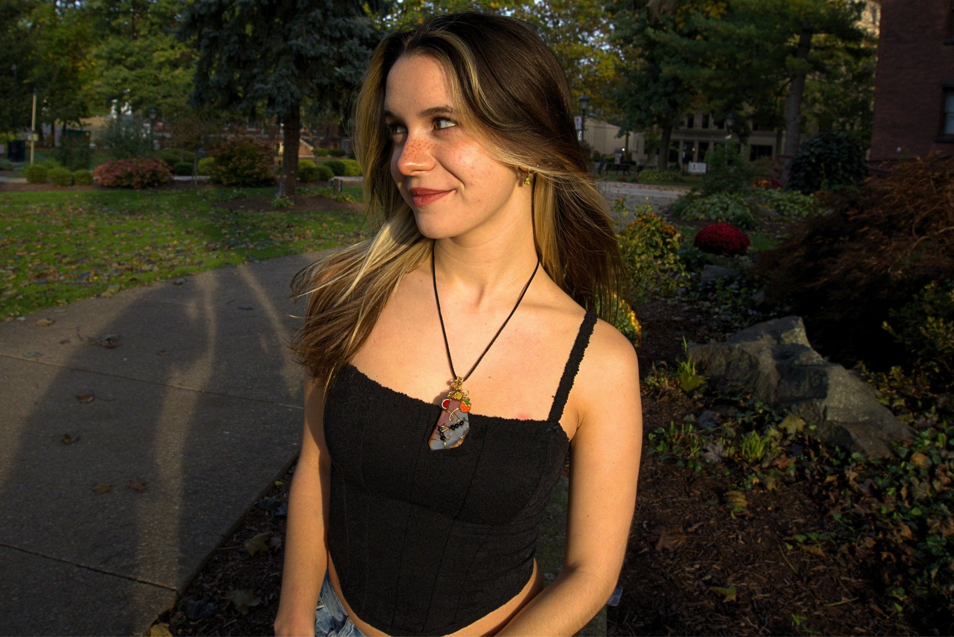 Add a playful touch to your look with this vibrant Red Agate slab necklace, featuring charming wire-wrapped details and tiny ants playfully following fruit charms. This unique accessory combines natural stone beauty with a whimsical design, perfect for sparking conversations wherever you go.