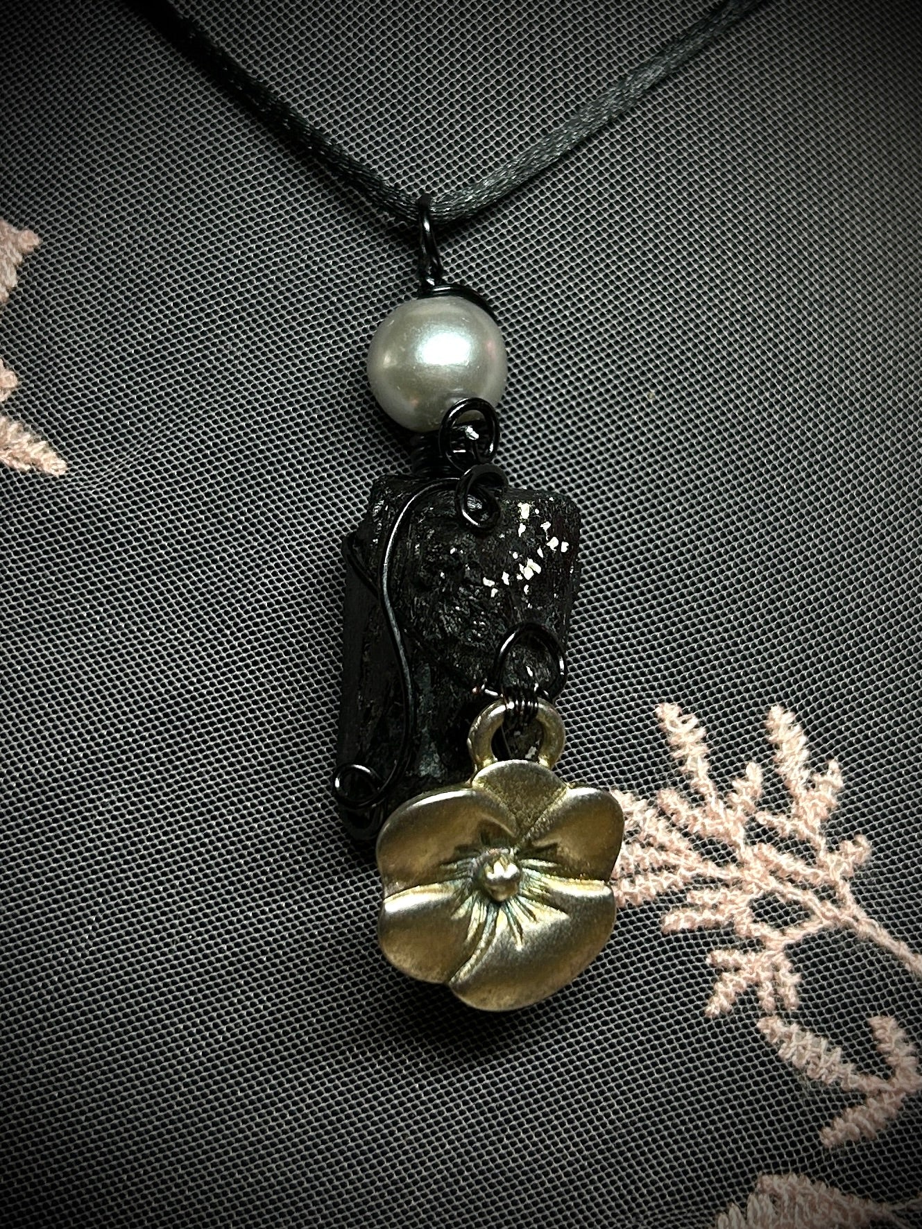 Add a touch of whimsy to your look with this Black Tourmaline necklace, featuring a charming vintage silver flower charm. Perfect for those who love unique accessories, it blends natural protection with playful style, making every outfit bloom with personality.