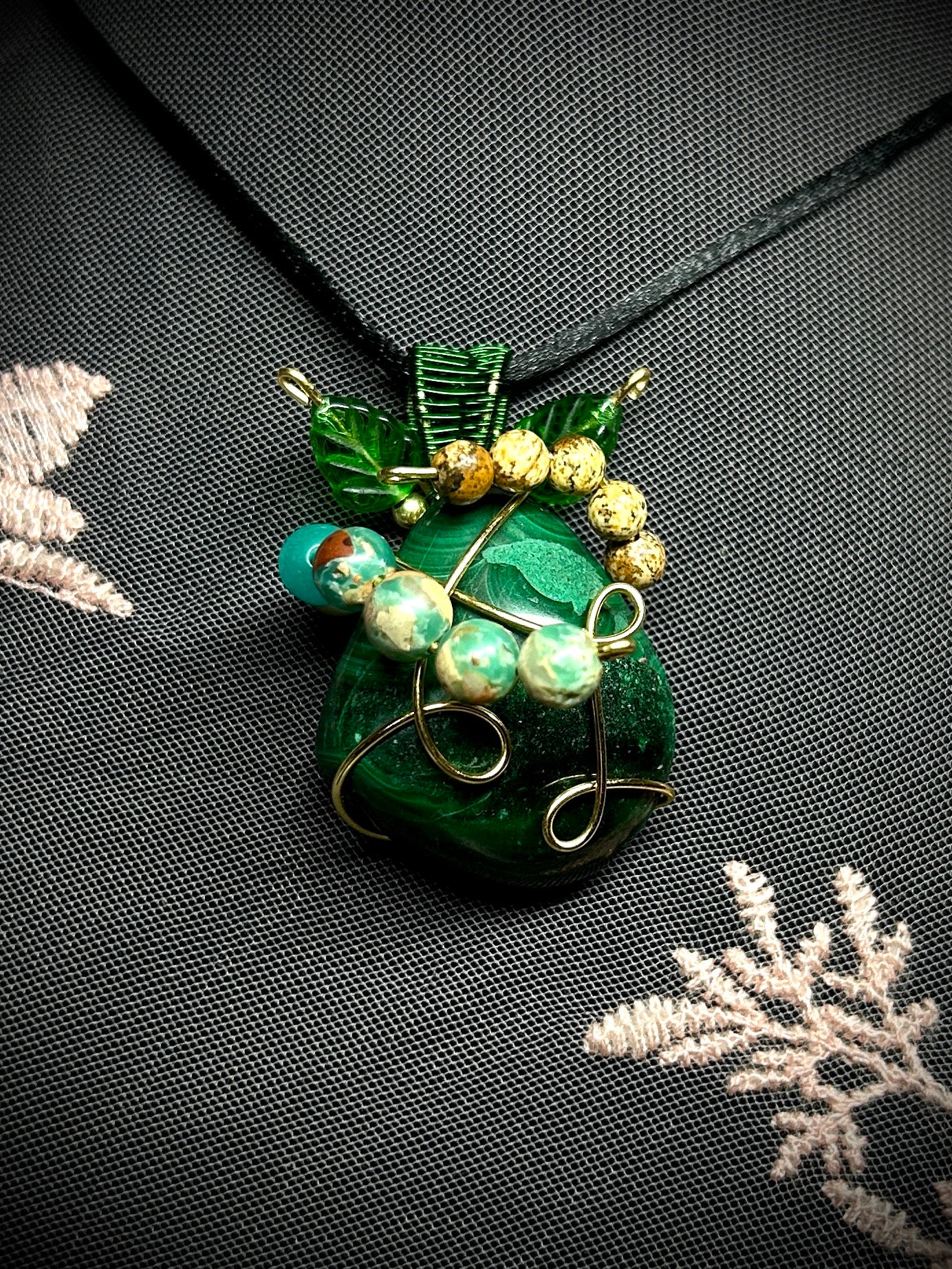 Add a playful touch to your style with this Caterpillars on a Leaf Malachite Necklace. Featuring a vibrant malachite stone wrapped with beads that mimic curious caterpillars resting on a leaf, this necklace brings nature’s whimsy right to your outfit. Perfect for anyone who loves unique, fun accessories that spark conversation and brighten any look.