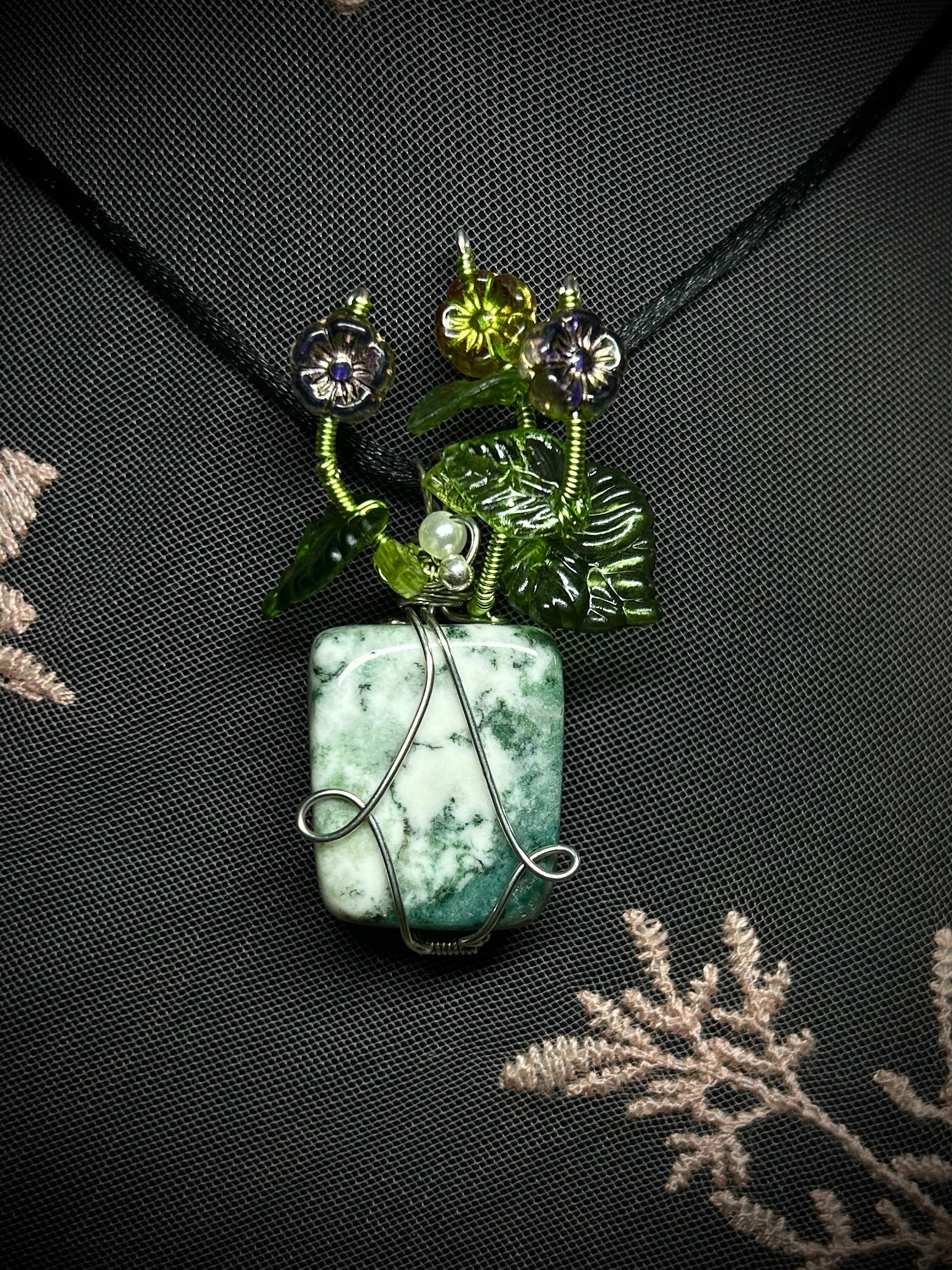 This whimsical necklace transforms a stunning moss agate stone into a charming potted flower arrangement. The natural green patterns within the agate resemble delicate foliage and blooms, while the creative wrapping gives it the appearance of flowers bursting from a tiny pot. Perfect for nature lovers and crystal enthusiasts who appreciate a playful twist on wearable art. A conversation starter that brings botanical beauty and earthy elegance to any outfit!