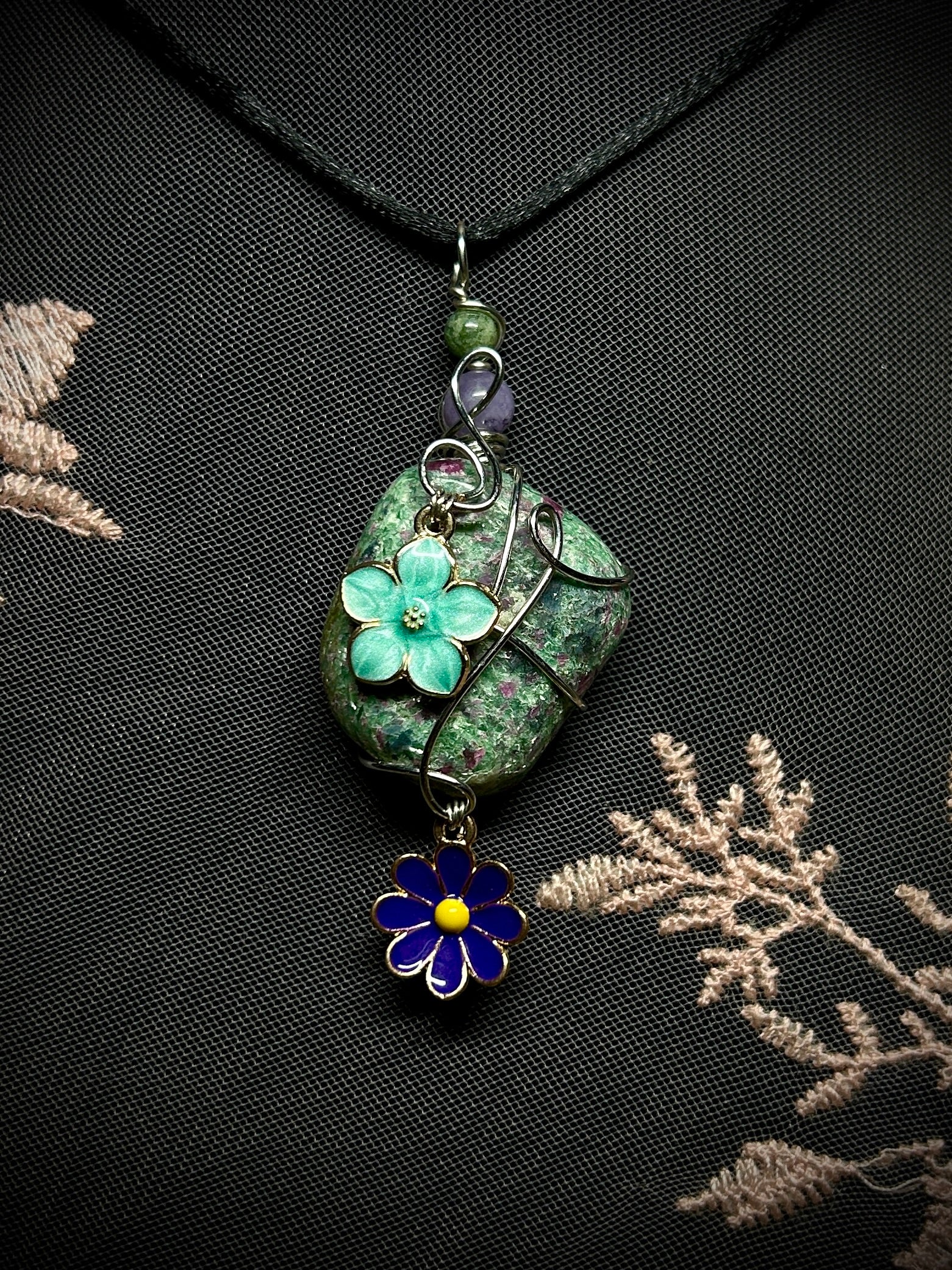 Add a splash of color and good vibes to any outfit with this playful Ruby in Fuchsite Necklace, featuring adorable flower charms. The vibrant ruby flecks set in soothing green fuchsite bring energy and balance, while the charming blossoms add a touch of whimsy. Perfect for brightening your day or gifting someone special who loves nature-inspired sparkle!
